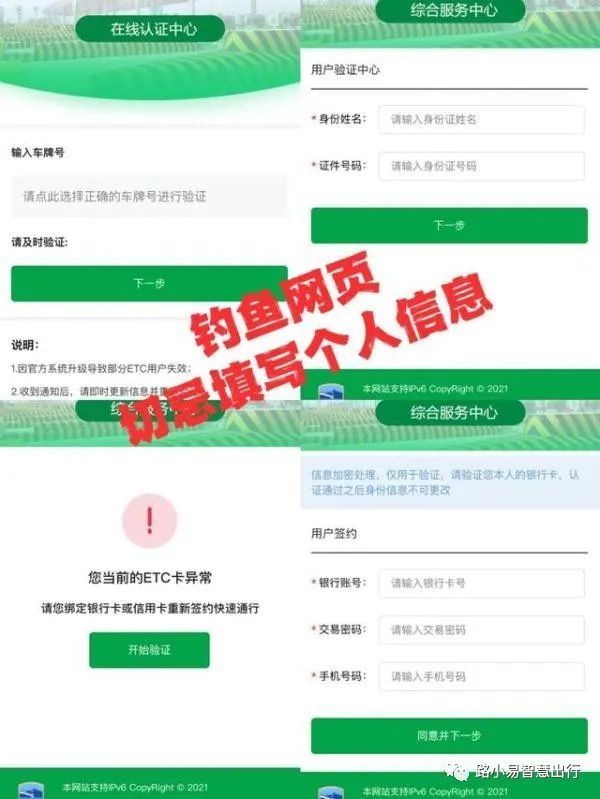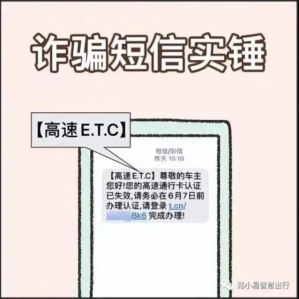 诈骗分子以ETC中心、高速管理中心等官方机构名义向广大车主发送短信,以“ETC过期、无法使用”为由让车主进行所谓的认证操作,同时附上事先准备好的虚假链接,引导受害人点进网站操作。这些链接一般是套取信息的钓鱼网站,有时还会含有木马病毒。